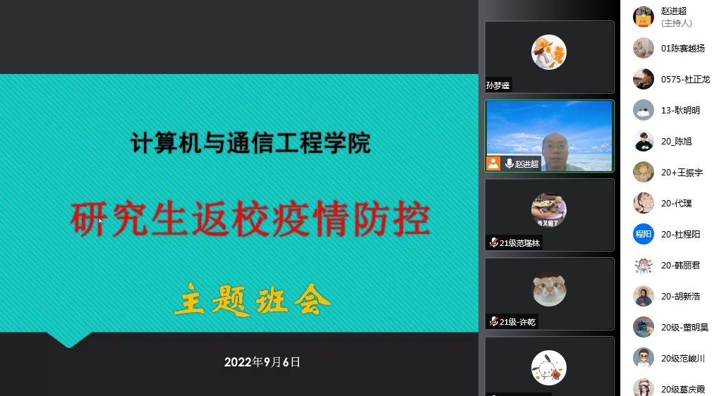 计算机与通信工程学院于2022年9月6日举办了返校疫情防控主题班会活动,学习入郑政策及相关要求,谋定而动,提前申请,按序审批,有序返校。