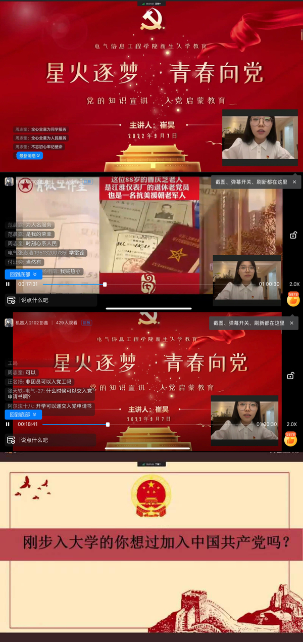9月7日晚,电气信息工程学院组织开展2022级新生开展 “星火逐梦,青春向党”党的知识宣讲新生入学教育,本次新生入学教育以钉钉线上会议形式召开。电气信息工程学院组织员崔昊、党员管理中心成员和全体2022级新生参加了此次宣讲活动。