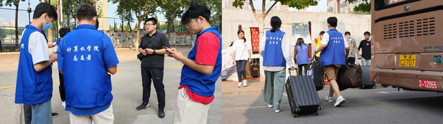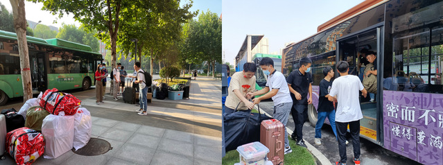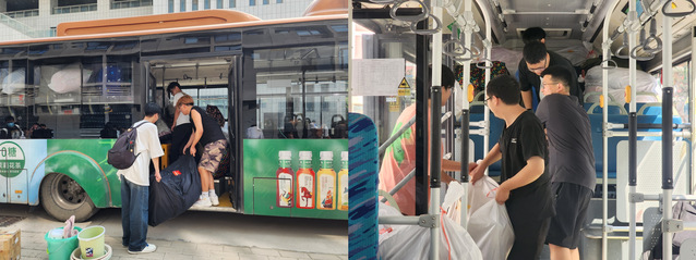 9月14日清晨,搬迁工作正式开始,25辆摆渡车按班级载着学子从东风校区出发,前往科学校区。摆渡车辆抵达后,顶着炎炎烈日,志愿者主动上前迎接,热情地从同学们手中接过一件件行李,指引同学们走进新宿舍。