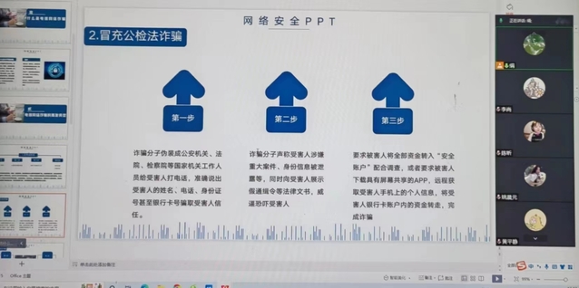 学习教育活动中,冯慧娟以“网络安全为人民,网络安全靠人民”的主题深入浅出地向大家介绍了网络安全的基本概念范畴,以及增强网络安全意识的重要意义。尤其对网络安全中存在的电信网络诈骗的高发类型以及我们应该如何防范与应对进行了详细介绍。