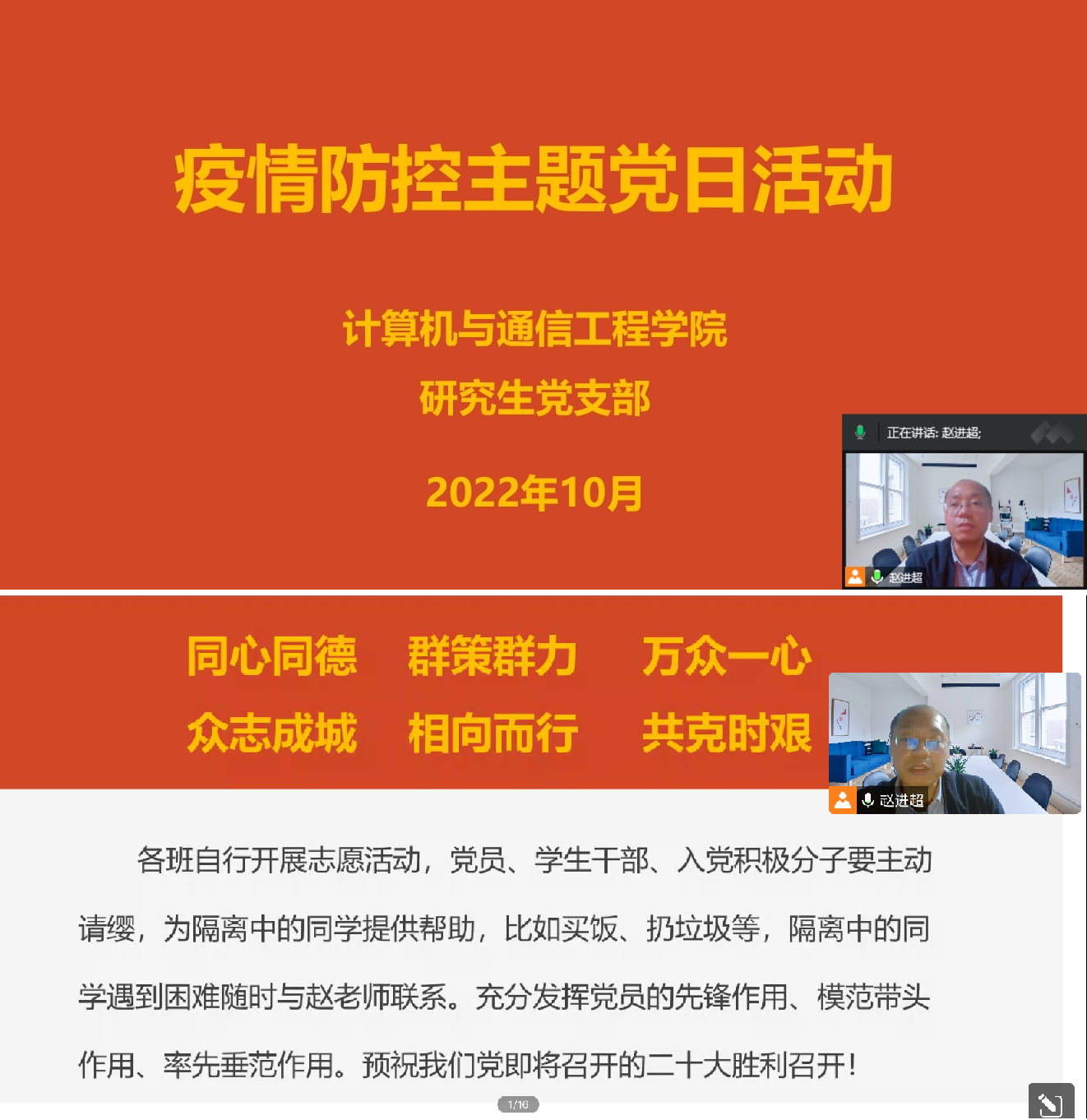 赵老师要求全体党员,尤其是学生干部要认真领会视频会议精神,科学精准做好疫情防控工作。不造谣、不信谣、不传谣,不在网上传播不实信息,理性、科学、客观对待疫情防控中的每一项工作和每一个细节。做好个人卫生,不聚集、不扎堆,做到少交叉,甚至不交叉,压实每一个人都是疫情防控的第一责任人的责任,落实网格长制度,防守底线!全体党员以坚持党性为集中体现,务必进一步发挥党员的先锋作用、模范带头作用、率先垂范作用!