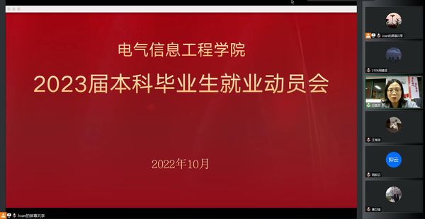 2022年10月20日晚,电气信息工程学院在线上召开了2023届本科毕业生就业动员会。学院党委副书记万慧杰、学院副院长曹卫锋、就业专职辅导员廉琼、毕业班辅导员孔朋、张晨然,以及2023届全体本科毕业生参加了此次会议。