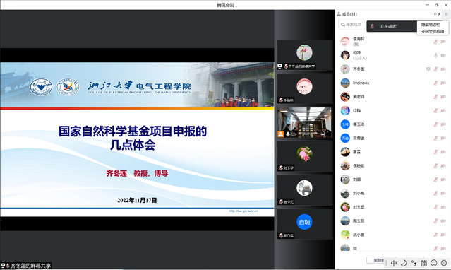 为扎实推进国家自然科学基金项目申报工作,进一步提高基金申报质量和水平,电气信息工程学院于2022年11月17日举办了2023年国家自然科学基金专家线上交流会。学院邀请浙江大学齐冬莲教授做了关于“国家自然科学基金项目申报的几点体会”的报告,会议由和萍副院长主持,电气信息工程学院全体2023年国家自然科学基金拟申报人员线上线下参加了会议。