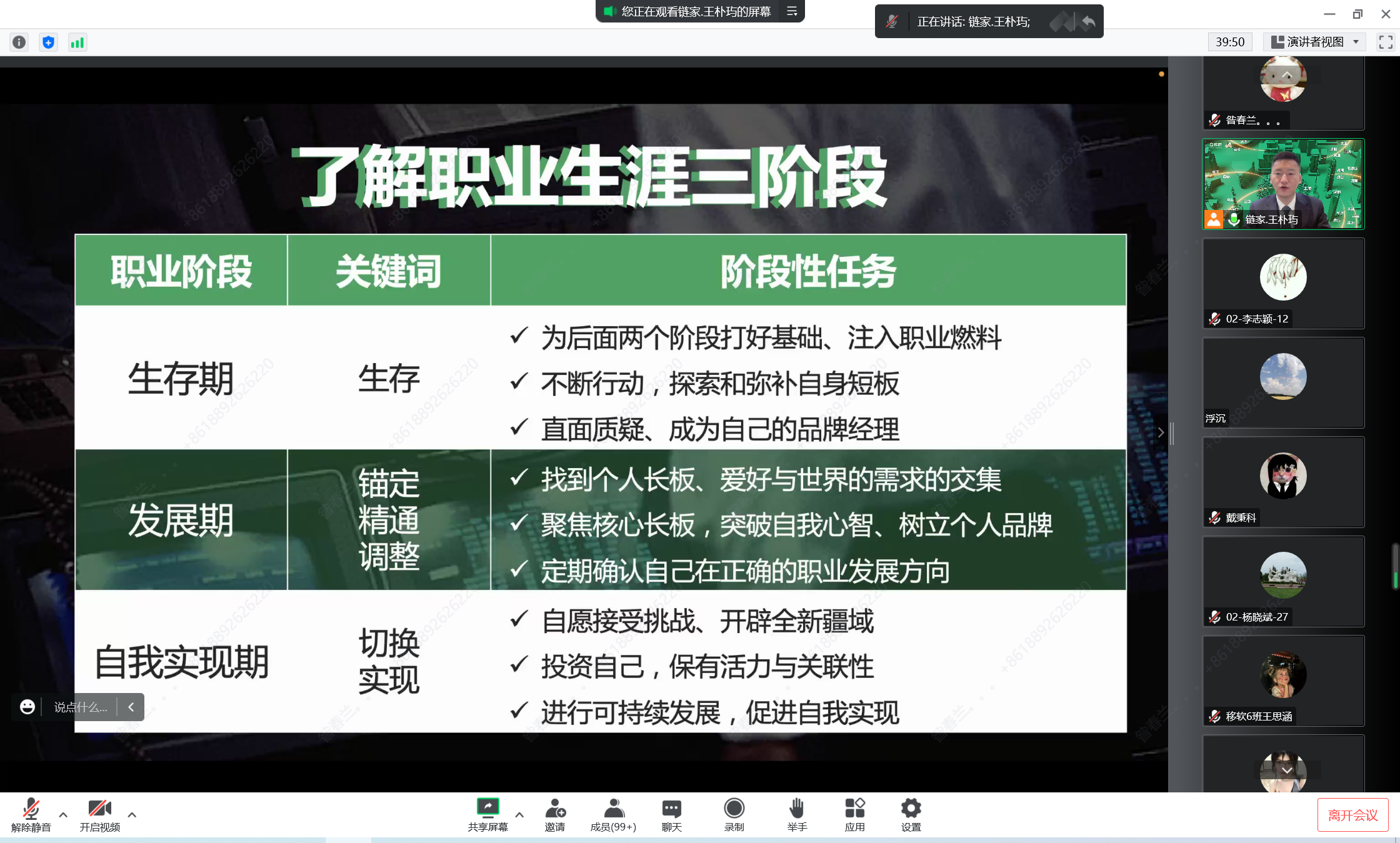 通过观看本次公开课,同学们进一步了解了职业生涯规划的重要性,为做好职业生涯规划提供了思路,提升了大学生的职业规划能力,也引导学生将个人的发展和社会需求结合起来,为今后顺利就业打下坚实基础。