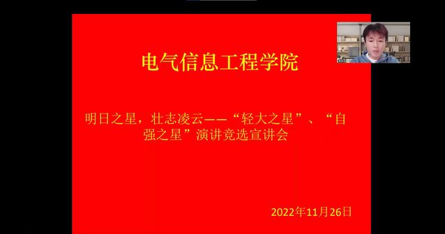 2022年11月26日下午,电气信息工程学院在线上成功举办了2022年度“轻大之星”“自强之星”演讲竞选宣讲会。出席本次会议的评委为电气信息工程学院主席团成员常丽涛、杨若琳、张立诚帅和马梦帆,参加本次会议的有十一位“轻大之星”、“自强之星”竞选人以及学生工作服务中心全体工作人员。