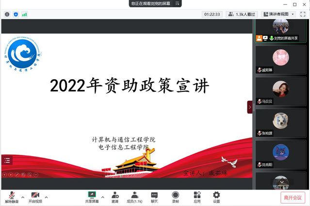为进一步做好学生资助工作,继续落实学生资助政策宣传“两节课”制度,9月7日,计算机与通信工程学院在腾讯线上会议开展了资助政策宣讲活动,学院资助负责老师马贝贝老师、王建新老师及2022级新生参加会议。