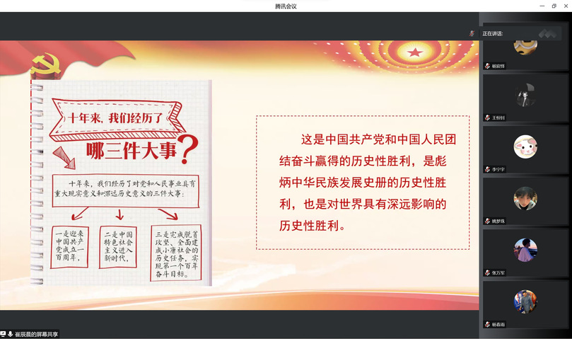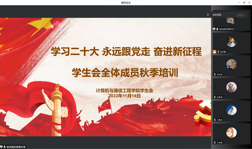 为加强学生骨干队伍建设,提升学生骨干素养,全面推进学生工作,切实引导青年学生以实际行动宣传贯彻党的二十大精神,11月14日,计算机与通信工程学院通过线上培训的形式组织开展学生骨干培训。本次培训活动由院团委书记孟牒老师和团干朱妍老师主讲,学生会全体成员参加。