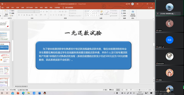 马老师详细讲解了国家助学贷款还款流程及征信系统,就国家助学贷款的相关政策、还款方式、支付宝还款操作等方面做了详细介绍;建议未还款同学按时、按量还款,提醒贷款毕业生毕业后的还息时间及流程。最后,王艳军书记号召全体贷款毕业生按时还本付息,恪守诚信、知恩感恩,做一个既对自己负责,又对社会负责的人,让诚信和感恩伴随自己奔向辉煌前程,传递爱、延续爱。