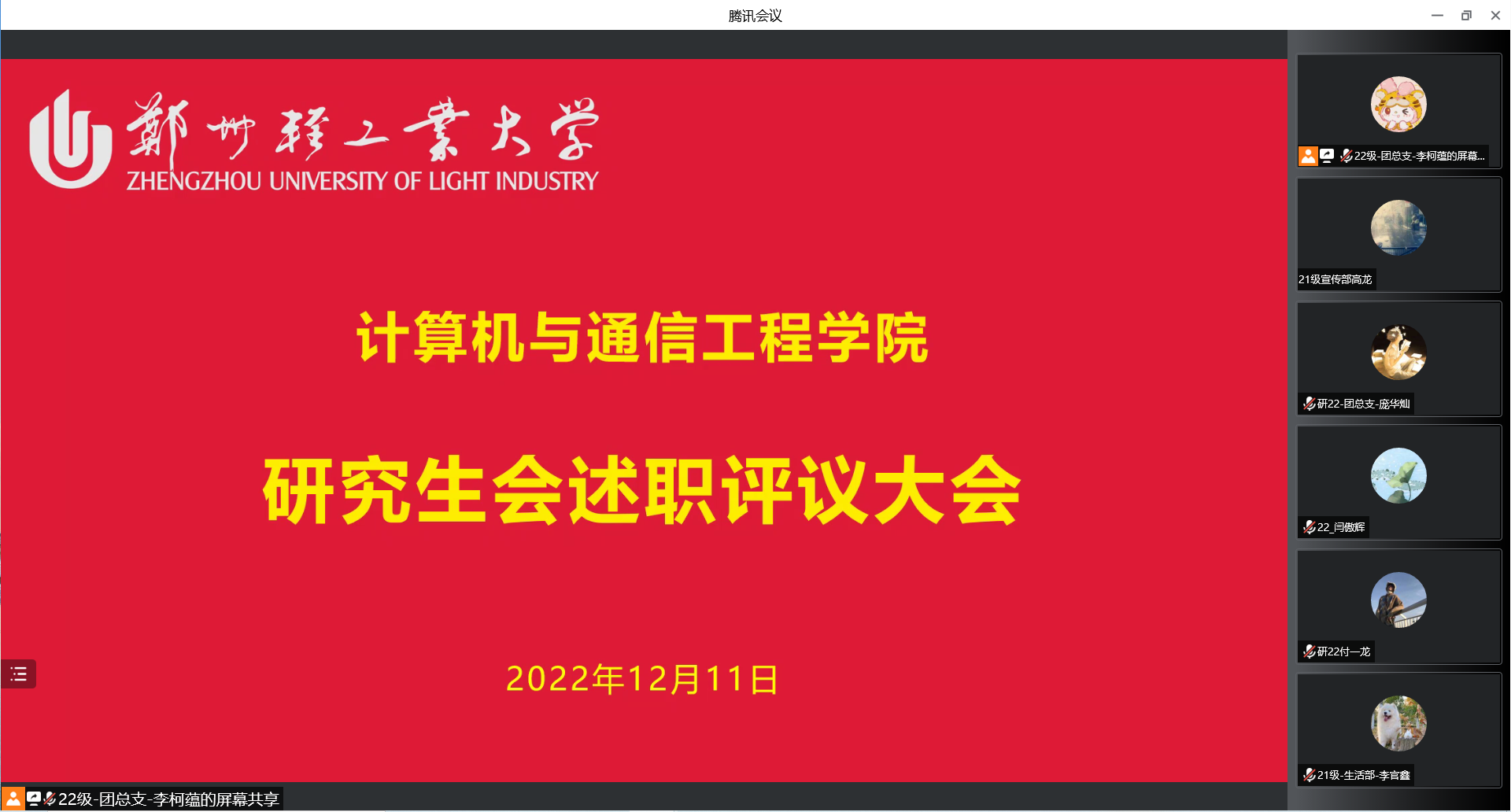 为进一步提升研究生会服务能力和水平,落实和加强研究生会工作人员的自我监督和管理功能。12月11日,计算机与通信工程学院在线上举行院研究生会成员述职评议大会。学院研究生管理办公室主任赵进超老师以及校研究生会学生代表作为评议小组成员出席了此次会议。院研究生会主席团成员和各部门负责人参加述职汇报。