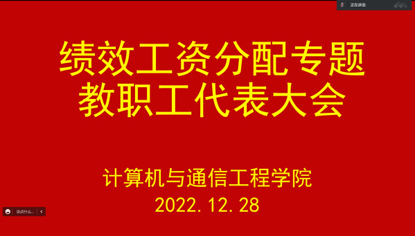 2022年12月28日下午4:00,计算机与通信工程学院通过腾讯会议线上召开专题教职工代表大会审议《计算机与通信工程学院绩效工资实施方案(试行)》,学院教职工代表参加了会议。会议由学院党委书记宋文军主持。