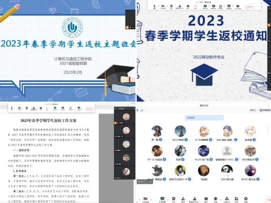 为贯彻落实学校关于2023年春季学期学生返校工作的相关要求,确保开学平稳有序,2月6日-7日,计算机与通信工程学院全体专兼职辅导员组织各班召开2023年春季学期学生返校线上主题班会。