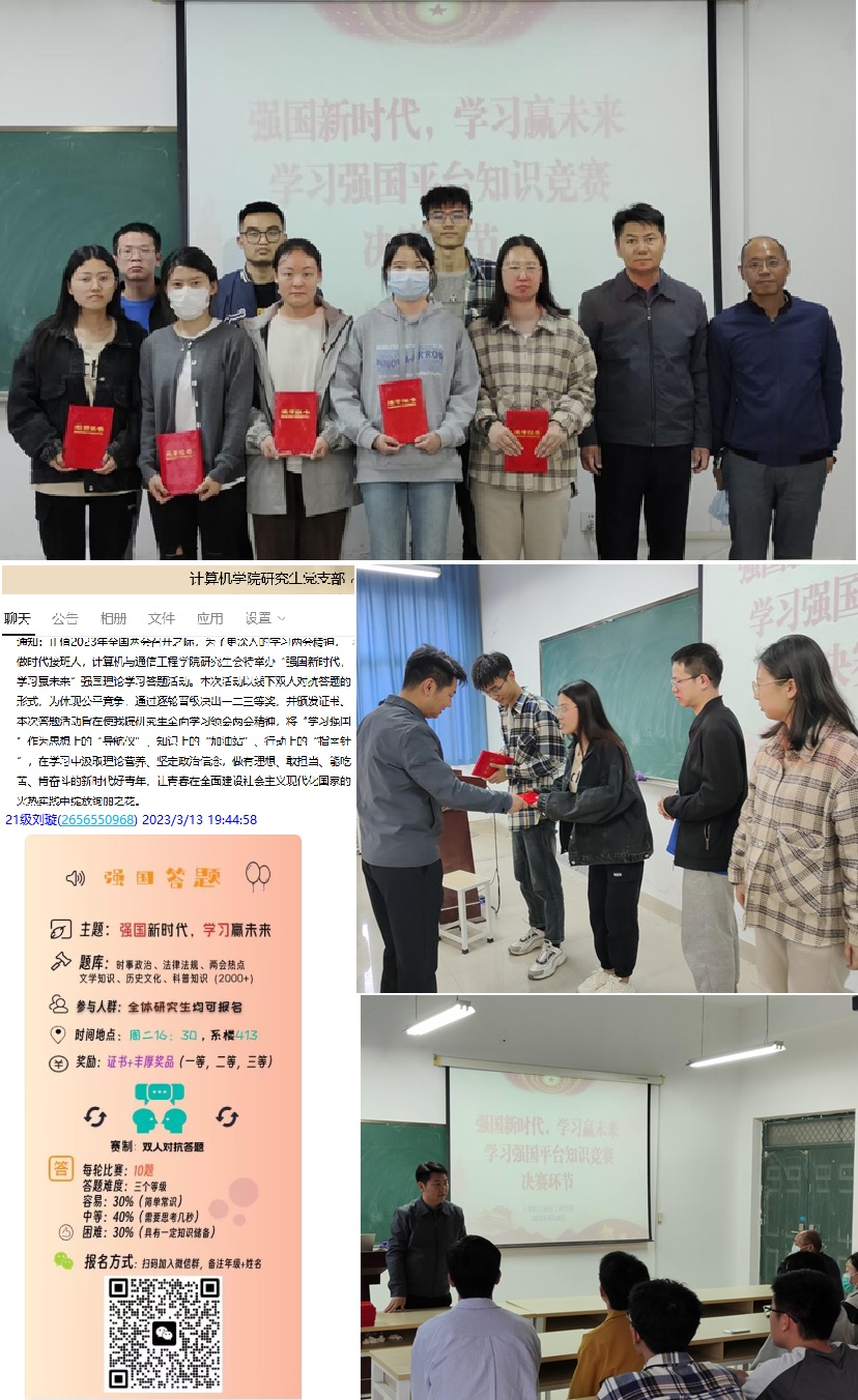 为深入学习两会精神,充分运用“学习强国”平台学理论、悟思想,进一步提高同学们的学习积极性,做新时代的“四有”新人。计算机与通信工程学院研究生会举办了以“强国新时代,学习赢未来”为主题的强国理论学习答题活动。活动面向全体计算机与通信工程学院的学生发出了邀请海报。
