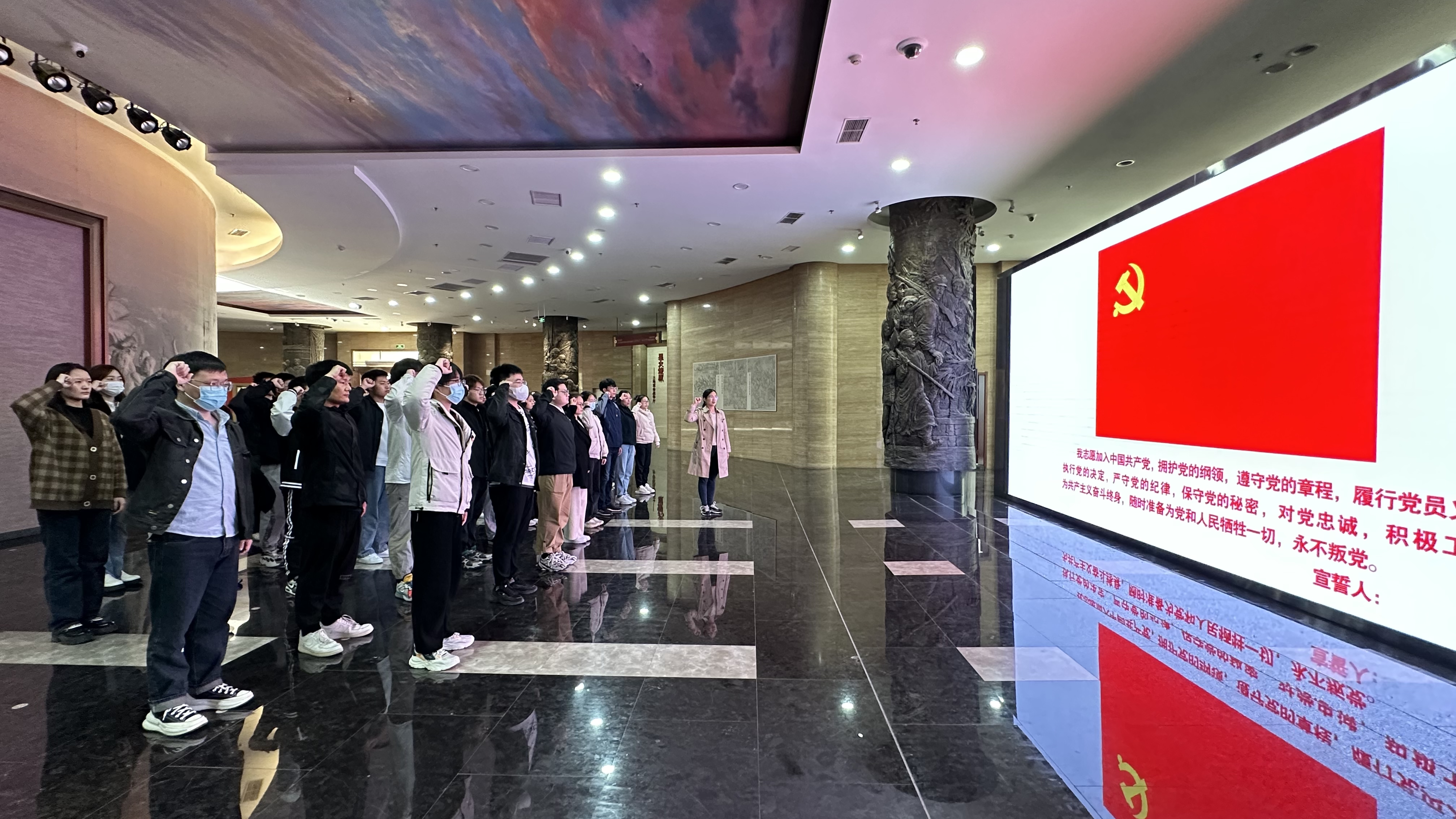 青山埋忠骨,翠柏凝英魂。革命先烈纪念碑前,全体党员列队整齐,肃立默哀,并为革命先烈敬献鲜花,凭吊烈士英魂。随后,全体党员参观了中原英烈纪念馆,回顾党的光辉历史和郑州在历史洪流中的发展历程。在解说员的引导下,全体党员认真聆听中原英烈事迹,感受英雄情怀,一段段可歌可泣的英勇事迹,感人肺腑,令人肃然起敬。最后,全体党员面向党旗庄严宣誓,重温入党誓词。铮铮誓言,落地有声,彰显着全体师生党员继承先辈遗志的决心与信心。师生党员们深受启发,大家纷纷表示,要珍惜今天来之不易的幸福生活,不忘历史,居安思危,踏着烈士们的足迹,在与祖国的深切连接中谱写青春之歌,在中国式现代化进程中贡献青春力量。