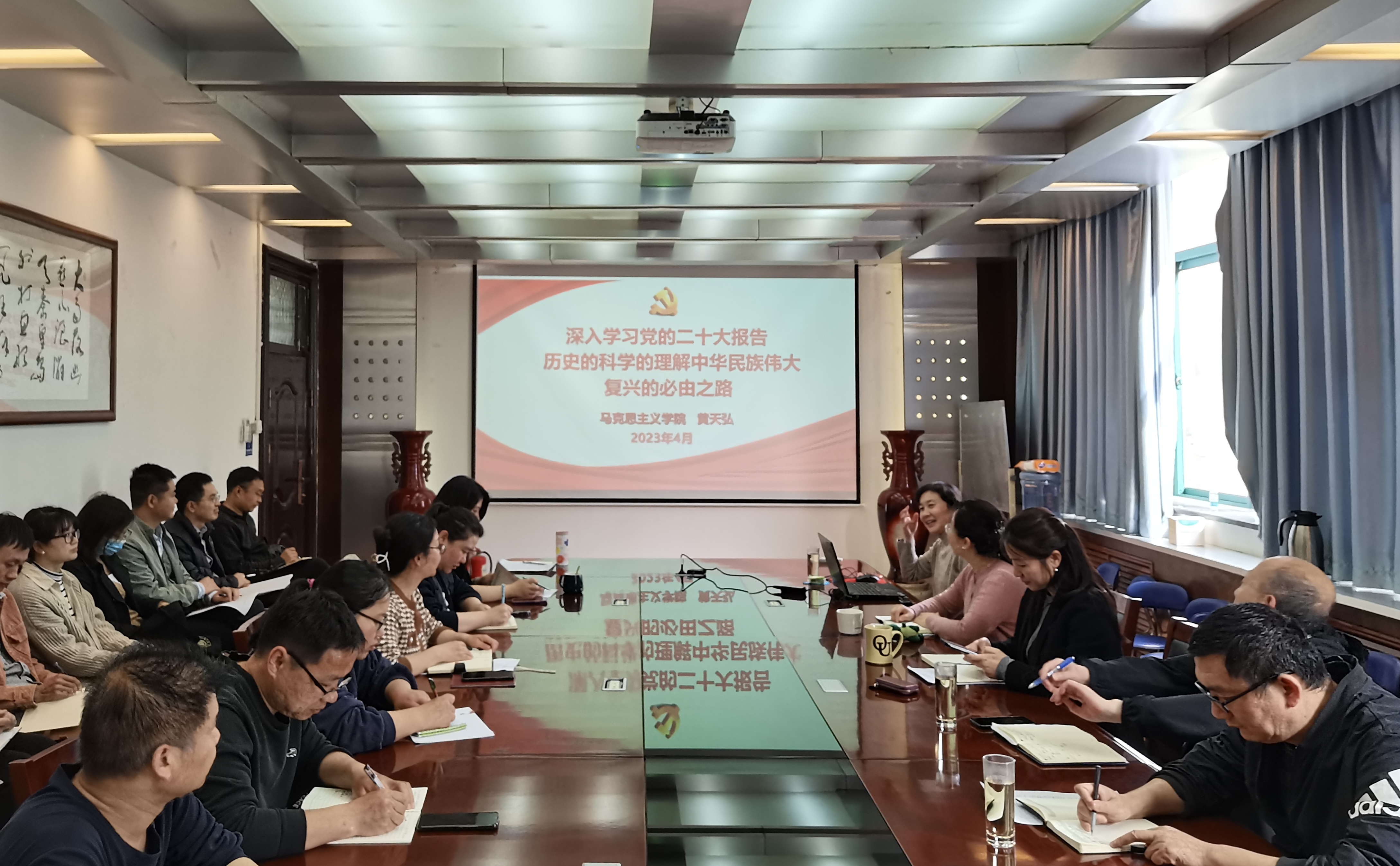 会议邀请马克思主义学院副院长黄天弘教授作题为《深入学习党的二十大报告——历史的科学的理解中华民族伟大复兴的必由之路》的专题辅导报告。黄教授从中华民族伟大复兴的主要论述、中国式现代化及其特征、新时代中国式现代化实践和理论探索的新成就等三个方面进行了深入细致的阐述;从历史的、科学的角度讲述了近现代以来中华民族实现中华民族伟大复兴的奋斗历程;论述了中国式现代化理论是科学社会主义的最新重大成果,是我们党领导全国各族人民在长期探索和实践中取得的重大成果。此次辅导报告内容丰富、立意深远、史料详实、逻辑清晰,参会教师认真听讲,很有收获。