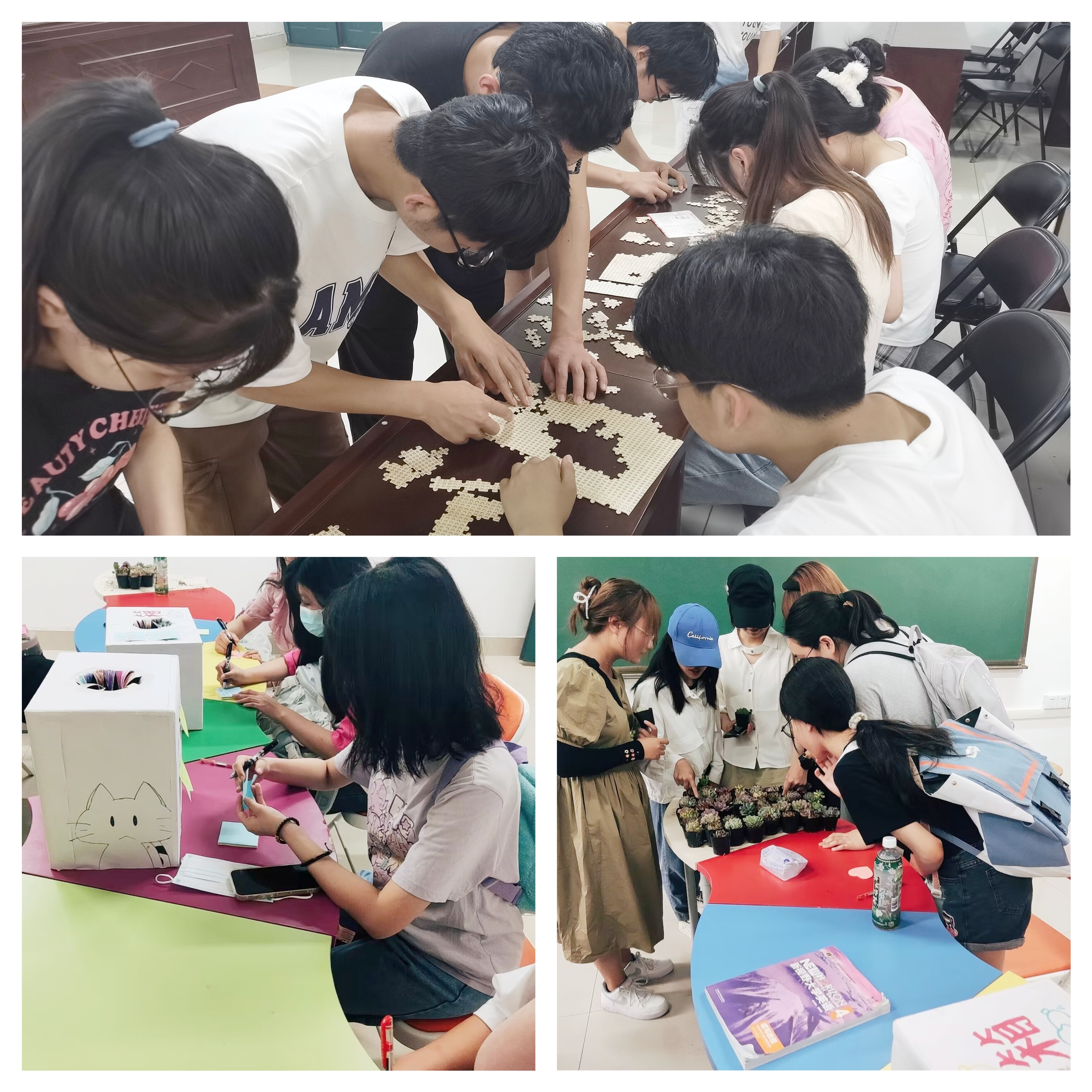 “解忧杂货铺,爱心灵回应”活动,给予同学们一个倾诉烦恼与分享故事的平台,通过采取匿名书信的方式,展现出“陌生人”间的互帮互助精神。活动中,负责人设置了“树洞倾听”收件箱和“解忧”收件箱。参与者可将想分享的内容写到信纸上,放入“树洞倾听”收件箱中。或者,参与者将自己最近的压力或者发愁的事情、想要对他人说的话写到“解忧”信纸上,放入“解忧”收件箱中。同学们可选择任意一个箱子抽出一张信纸,看完后可在信纸上选择留下自己的心情或感悟再放回。“爱拼才会赢”活动包含拼图环节和叠砖块真心话大冒险环节。在拼图环节中,同学们按照组别进行活动,相互之间通过沟通、协作和团队力量完成拼图目标,这不仅有助于打破彼此之间的陌生感,更能够促进沟通交流、协同合作能力的提升。一块块小小拼图,寄托了一份份难以言喻的期望与美好。在叠砖块真心话大冒险环节中,同学们两人一组,随机抽取题目,让对方回答问题,或者自己承受相应的惩罚。在一片欢声笑语中,同学们分享乐趣与困惑,释放内心压力。