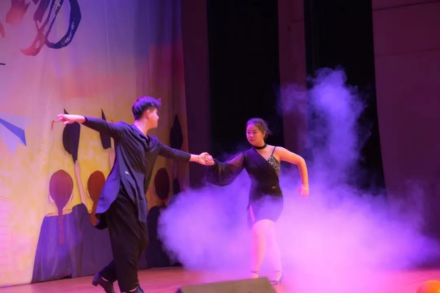 接着,一段充满热情和活力的双人恰恰拉开了晚会的帷幕,点燃全场气氛。