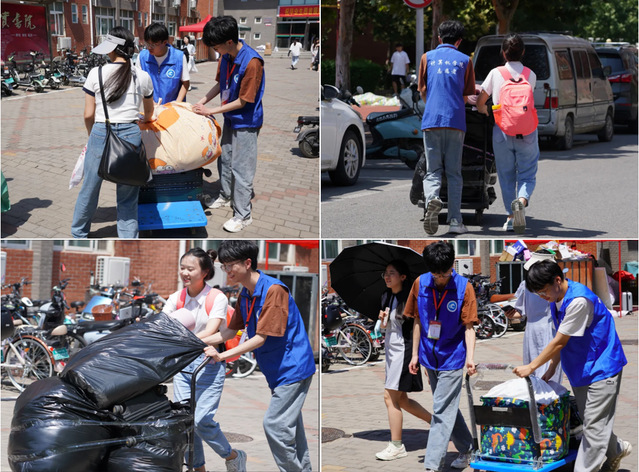 志愿者们身着统一蓝色马甲,带着热情的笑容,早早站在宿舍公寓门口做好准备。他们手提背包,拉着小车转运行李,耐心解答毕业生的问题和提供相关信息。烈日炎炎,汗水从志愿者们脸颊滑下,浸湿了衣服,手心的勒痕逐渐加深,体现出志愿者们不怕辛苦,甘于奉献的服务热情。这项贴心的服务减轻了毕业生们的离校负担,让他们带着母校的温暖和爱护开始新的人生阶段。此外志愿者们还为每位毕业生送上精心准备的小礼物,希望能为他们的毕业旅程增添一份专属纪念。