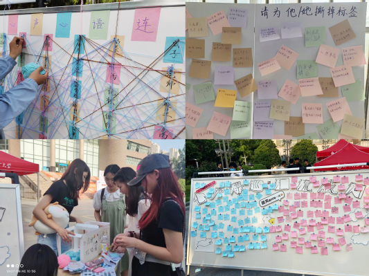 蒲公英素质拓展活动《迈出一步,遇到心声》,同学们在现场纷纷拿上提前分配的礼仪引导卡片,开始向周围路过的形形色色的行人上前普及礼仪常识,在活动的过程中,积极鼓励参与学生迈出勇敢的步伐,与他人沟通,引导参与学生分享自己的心路历程以及感受,增强自卑敏感学生的自信心。项目《心声漂巡,汇流成河》活动现场,每位同学在不同的两张纸条上写下一件自己不开心的事情,一件自己开心的事情,由各班心理委员收齐后交到负责人手中,由负责人进行分类,分别放置到“情绪垃圾箱”和“快乐收集箱”的两个盒子中,抒发情绪,调节心情。活动进行到后期,参与到其中的同学很多主动拿起手机拍摄展板,或驻足停下阅读展板上的便签与一个个暖心的话语和实用的解决方案,他们留下了自己不开心的事情,收获了他人的快乐。《心声心语,连线表意》主题活动现场,工作人员事先准备好一张白色大展板,在展板上贴上一些各式各样的标签,在标签上钉上钉子,由负责人介绍各种颜色毛线所代表的心情,如粉色毛线代表生气,紫色蓝色代表开心,绿色代表讨厌,棕色代表害怕。由路过的同学在自己喜欢或是讨厌的标签上进行缠绕,形成情绪线路,以此来表达自己的情感,更好的梳理自己的情绪。《不被标签定义的我》主题活动中,现场布置了各类标签纸,同学们发现自己不喜欢的标签之后可以把它撕下来,并在新的纸上写下自己想说的话再粘回板子上。通过这个活动,让大家了解自己、正视自己,引导同学们在生活中不被他人的目光和评价所束缚,同时保持理性客观的头脑,不轻易给他人贴标签,能更加自信从容的面对生活。