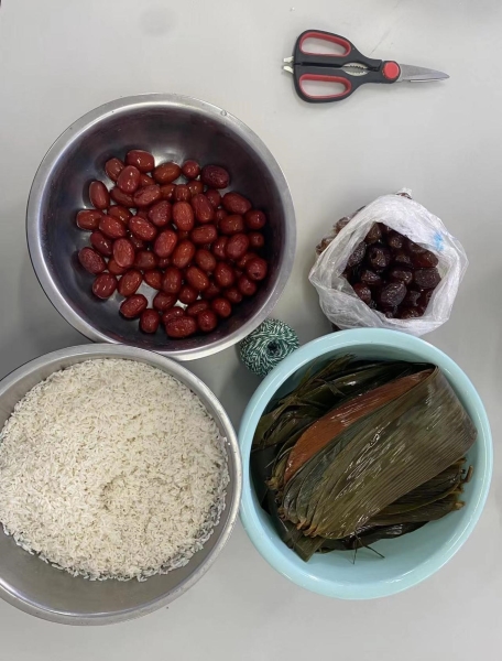 活动开展前,老师们提前准备好的粽叶、绳子,以及泡好的糯米、蜜枣、红豆等食材。大家先通过视频教程认真学习包粽子。有经验的老师,动作娴熟地拿起粽叶,快速地卷成漏斗状,再行填米、压紧、扎绳,一个个粽子陆续诞生,动作如行云流水。年轻老师虚心向经验丰富的老师学习,经观摩、演练,很快掌握入门方法,一个个都包得有模有样,有三角形的、长方形的、扁平体的,形状各异,富于特色。活动现场,大家忙得不亦乐乎,欢声笑语不断。