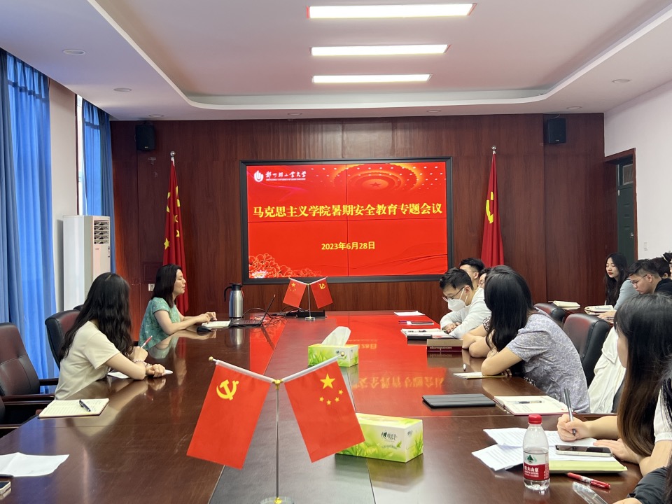 暑假将至,为进一步提高学生的安全和自我保护意识,提醒同学们牢固树立安全意识,增强自防、自护、自救的能力,保证我院学生假期期间安全教育工作正常展开,马克思主义学院于6月26日在学院512会议室组织全体研究生召开安全教育主题会,会议由党总支副书记冯慧娟主持。