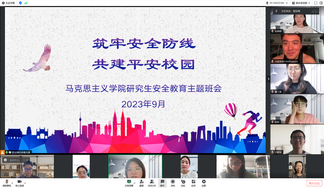 为进一步落实研究生安全教育工作,切实增强安全意识,提高自我防范能力,维护校园安全稳定秩序和学生人身财产安全,9月7日和8日,马克思主义学院通过线上线下相结合的方式召开了安全教育主题班会。此次活动21级和22级班主任郭发、章冠博主持,2021、2022级全体研究生参加。