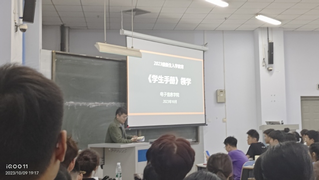 10月9日晚,电子信息学院在教三楼203组织全体2023级本科生学习《学生手册》,会议由新生辅导员王伟夙主持。