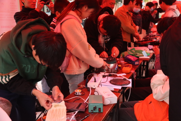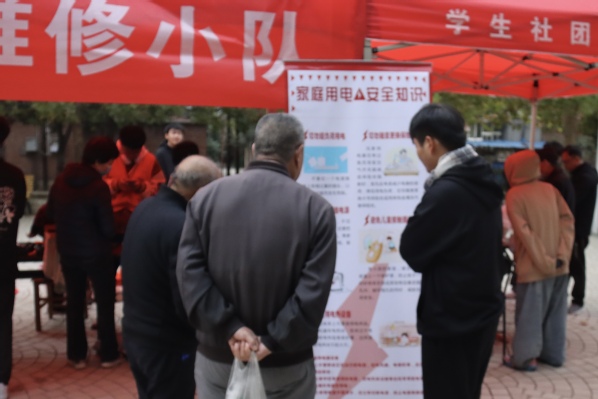 下午3时许,在高鹏飞老师带领下,志愿服务师生一行来到社区广场,摆开桌凳,打开工具箱,开始收集老旧、损坏的家用电器。志愿者有条不紊地对故障家电进行登记,贴标签、标注姓名、联系方式等信息。大家运用专业知识、技能将社区居民送来的烧水壶、电风扇、电饭煲、吹风机、破壁机等小家电进行维修。同时,还向居民群众介绍家用电器安全使用规则及节电小常识,避免因使用不当造成伤害及损失。在3个小时的活动中,志愿服务师生维修各种家用小电器近百件,同学们热诚的服务、专业的态度和精湛的技术获得了社区居民的一致认可和好评。