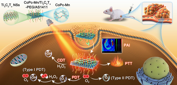 近日,材料与化学工程学院张治红教授和新能源学院杜淼团队在《ACS Nano》(影响因子17.1,中科院1区)报道了多模式癌症治疗最新研究成果。团队利用锰桥联的钴酞菁配合物和Ti3C2Tx MXene纳米片(CoPc-Mn/Ti3C2Tx)构成肖特基异质结型纳米酶,作为一种具备I型和II型光敏剂,通过808 nm近红外光照下的光声成像引导的多模式化学动力学/光热/光动力疗法策略,增强癌症治疗效果。肖特基异质结纳米酶不仅具有窄禁带宽、增强电子-空穴分离能力和显著的氧化还原电位,且在体外展现出优异的H2O2和O2供应性能。AS1411靶向的CoPc-Mn/Ti3C2Tx纳米酶通过体内外多模式治疗策略展现出高准确性和出色的抗癌效率。