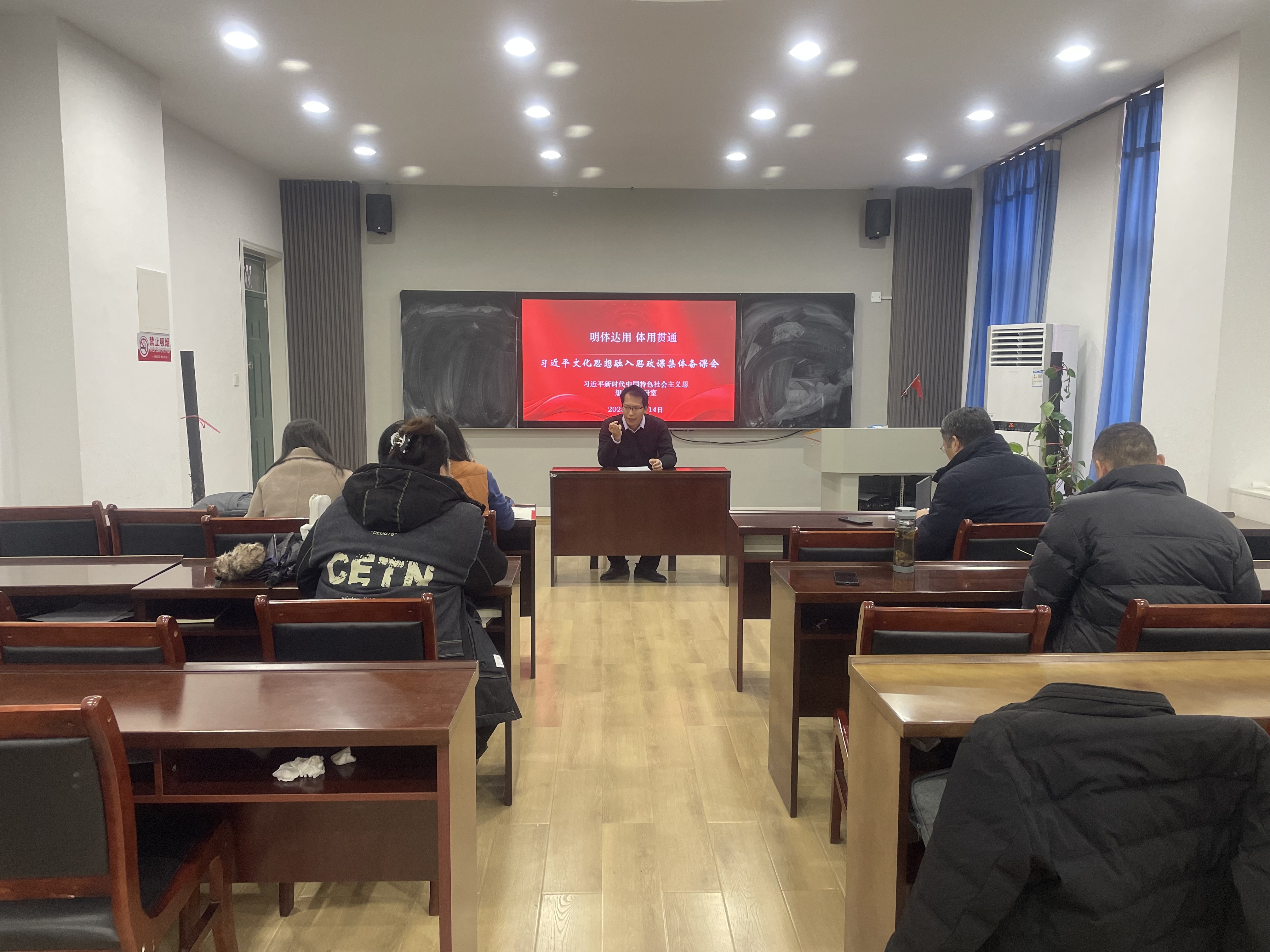 教研室主任张少停老师在集体备课会上做了“明体达用 体用贯通——深刻把握习近平文化思想的鲜明品格”主题报告。报告从“体”与“用”所体现的中国哲学与中华民族思想智慧出发,阐释了习近平文化思想明体达用、体用贯通的鲜明品格,深入浅出分析了这一思想在文化理论观点上的创新与突破和对中国特色社会主义文化建设规律的把握,是新时代我国社会主义文化建设的思想武器和行动指南。
