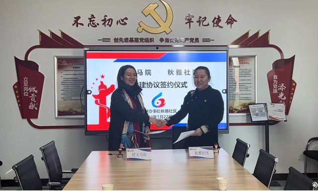 马克思主义学院党总支副书记冯慧娟与秋雅社区党支部书记刘春艳在共建社会实践基地协议书上签字并合影留念。
