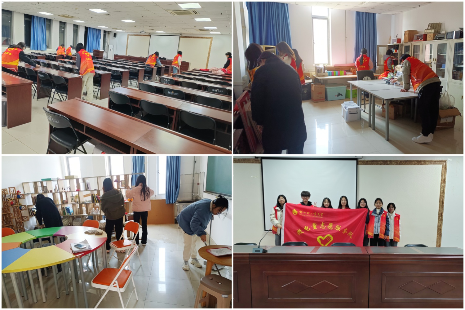 活动伊始,志愿者们分为三组,身着志愿马甲,有序地领取整理工具,按照提前分配好的任务,来到学院心理咨询室、学生活动室和会议室,清理闲置物品,清扫垃圾和灰尘。通过打扫,学生活动室物品摆放井然有序,会议室变得焕然一新,咨询室变得干净明亮。活动中志愿者们不怕脏、不怕累,分工合作、齐心协力,展现出积极向上的精神风貌和“奉献、友爱、互助、进步”的志愿服务精神。