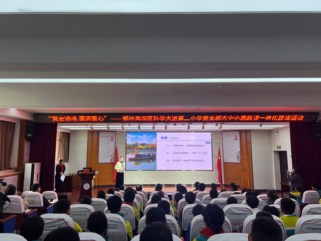 活动中,丁泽丽副教授从五星红旗上五颗星星的涵义说起,引出授课内容。继而,通过“南陈北李”传播马克思主义思想、筹划早期党组织,让队员们了解党诞生的背景。随后,丁教授讲述中共一大从石库门到南湖的召开经过,并又用一段视频向队员们介绍了红船精神,体会其开天辟地、敢为人先,坚定理想、百折不挠,立党为公、忠诚为民的精神内核。最后,丁教授总结为什么中国共产党的成立是开天辟地的大事变,并号召队员们作为新时代的队员应学习革命前辈勇当先锋的精神,爱学习、爱劳动,从身边小事做起,为我们国家建设贡献自己的力量。活动的尾声,全体学生以歌咏志,唱响《中国少年先锋队队歌》,慷慨激昂、振奋人心的歌声久久回荡在宽阔的会场上,奋发拼搏、报效祖国的决心也深深植根于少年学子的心中。