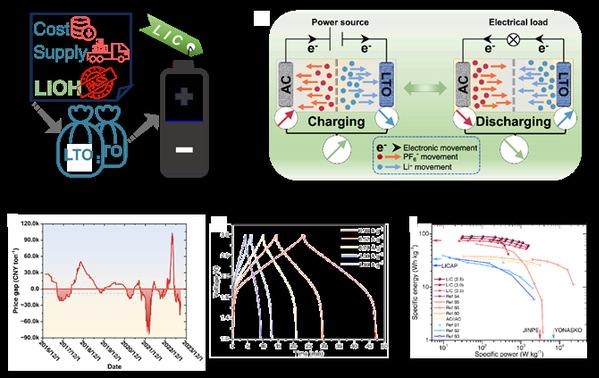 优异的材料和新颖的器件结构是满足日益增长的储能需求的关键因素。锂离子电容器作为非对称超级电容器的一种典型代表,利用电池的高比能量和超级电容器的超大比功率来满足均衡的电化学储能要求。尖晶石型钛酸锂固有的和不可替代的优势使其成为动力电池和锂离子电容器的最佳候选者之一。然而,上游市场的波动,例如原材料价格飙升和供应短缺,极大地威胁到尖晶石型钛酸锂的生产、销售、应用。柔性生产工艺,即使用廉价易得的氢氧化锂水合物来替代价格高且供应紧张的碳酸锂以生产尖晶石型钛酸锂,有助于相关产业在特定市场周期中克服挑战。该研究工作从新的视角报道了自氢氧化锂水合物起始,以高质量的碳酸锂作为中间产物,在羧化后跳过分离步骤,从而实现成本和技术维度更加有效的尖晶石型钛酸锂生产路线。所得尖晶石型钛酸锂的电化学性能优于商业竞争者。以所得尖晶石型钛酸锂作为负极材料的锂离子电容器的比能量达到89.5Wh/kg。这些结果表明,寻找技术可行、成本可控、供应链稳定的钛酸锂合成路线以应对周期性市场波动的策略和实践取得了成功。