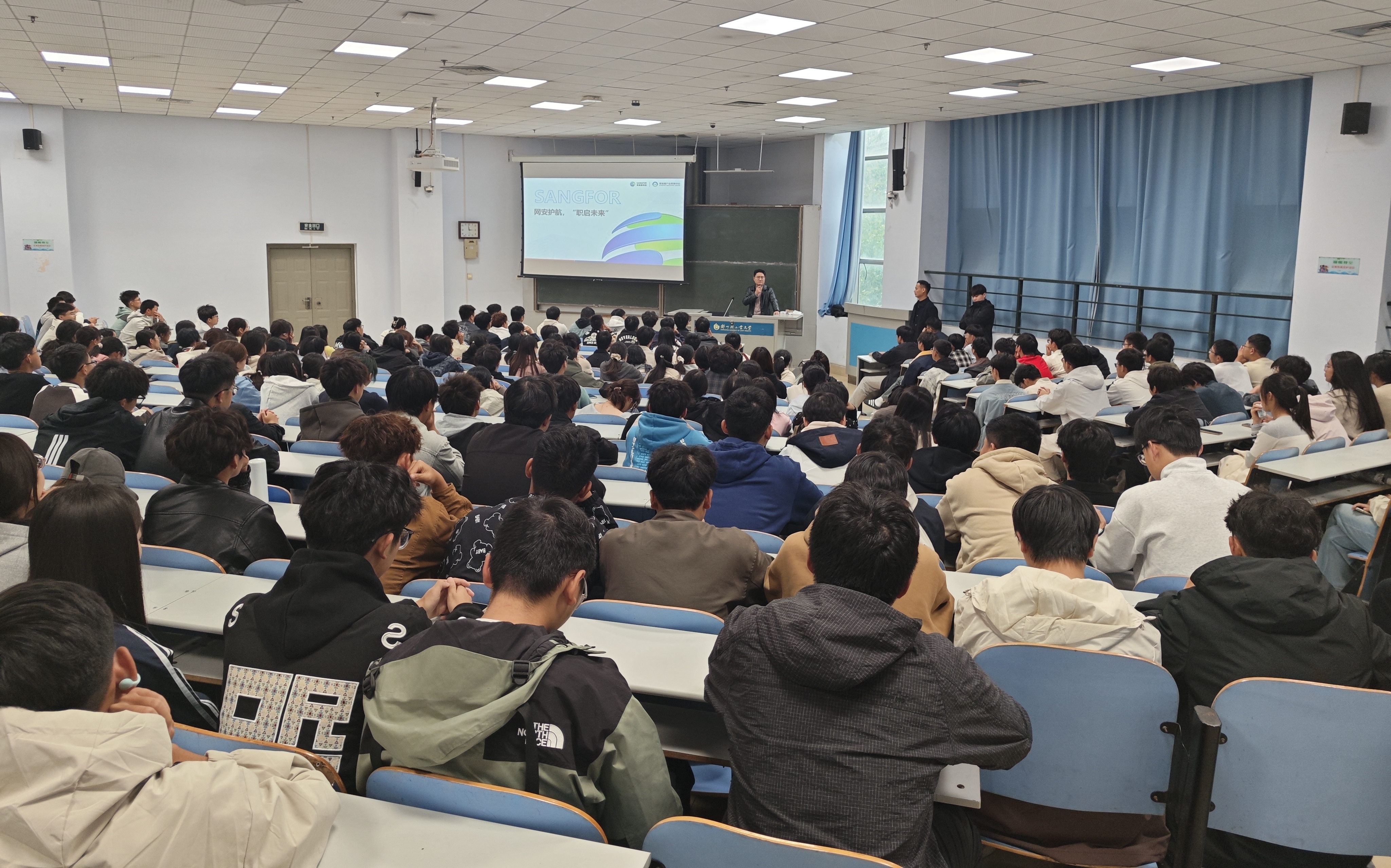 10月9日下午,计算机科学与技术学院在东风校区教三楼202室举办“网安护航,职启‘未来’”专题行业讲座,讲座特邀河南网训科技有限公司(深信服SELP-C)副总经理史彦武主讲。学院网络工程系2025级全体学生参加活动。