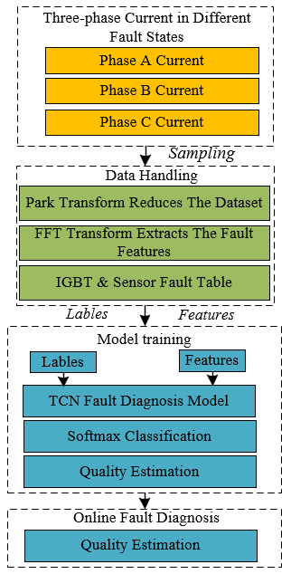 因此,论文提出了一种基于派克、傅里叶变换和时间卷积神经网络(Park-FFT-TCN)结合的故障诊断方法,该方法在故障提取方面利用Park变换与FFT相结合,相比较于传统单一的利用Park变换提取故障特征或者直接运用FFT对三相电流提取故障特征,该方法使得故障特征提取计算更简便,提高了抗噪能力,也突出了故障特征,便于准确检测和诊断故障;在故障诊断方面,采用6层残差块堆叠的时间卷积神经网络,该模型具有较强的泛化能力和鲁棒性。仿真与实验结果表明,所提方法能够准确诊断三相逆变器IGBT开路故障和电流传感器故障。