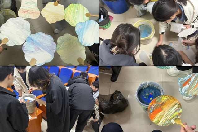 10月18日晚上,嵌入式软件2024级3班举办了“扇舞心韵:漆扇创意拓展之旅”的心理活动。活动前,班委投影播放漆扇文化短片,从古代文人扇面题诗到现代漆扇工艺创新,趣味故事吸引同学们专注聆听。在创作环节,心理活动室化身创意海洋。同学们或低头沉思构思路径,或围坐交流色彩搭配,男生用色比较大胆,女生们则偏爱清新雅致的风格。高可盈同学作品以枫叶形扇为基底,调配黄、蓝、粉色,最终一个淡雅清新的漆扇从水里出来。作品完成后,大家各自向同学展示自己的成品,教室里充满了笑声和夸奖。