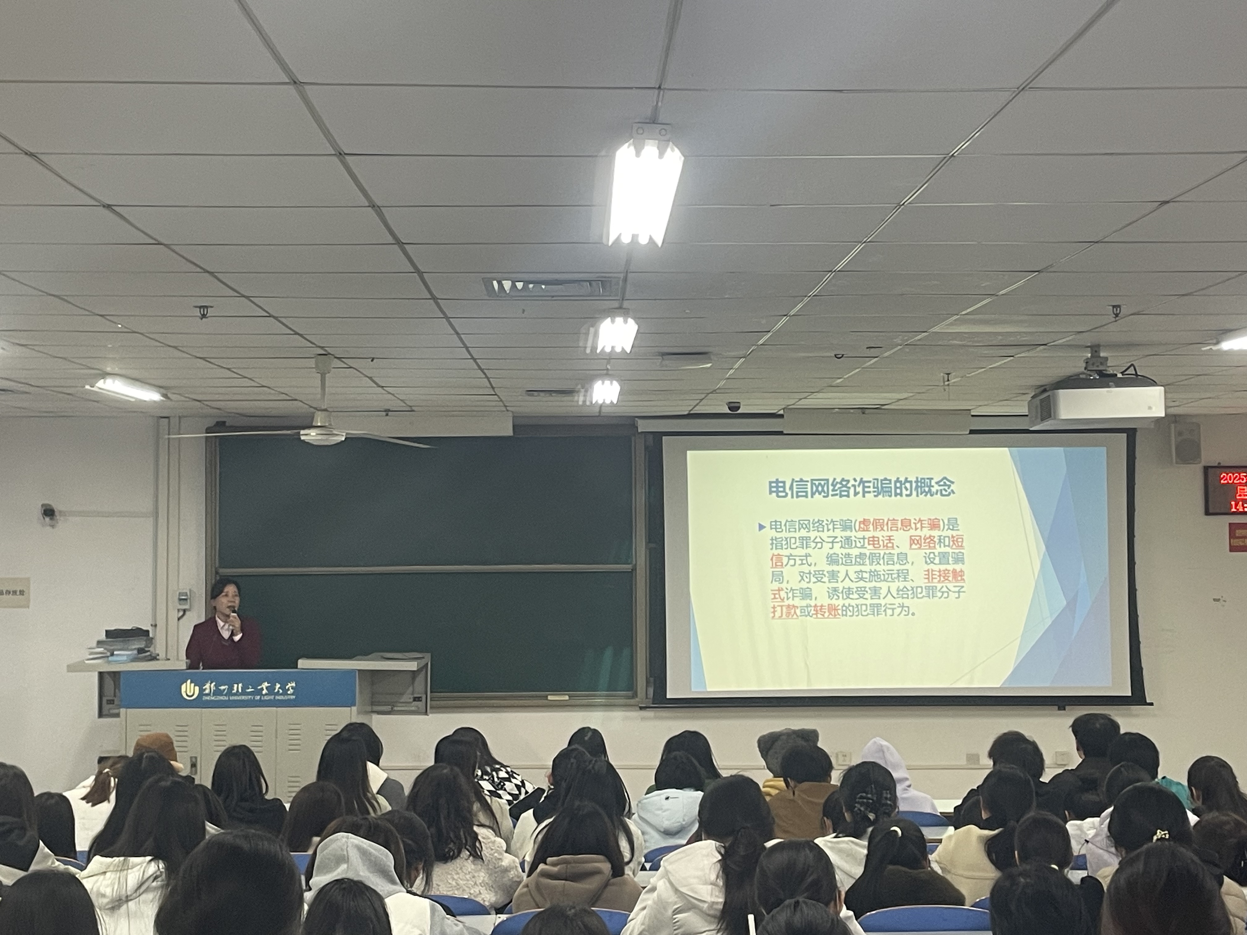 讲座中,韩老师结合“刷单返利”“冒充客服”“虚假交易”等大量真实案例,从电信网络诈骗的概念界定、当前高发诈骗手段的深度解析以及遭遇诈骗后的具体应对措施三个核心方面为同学们进行了系统讲解。在此基础上,通过设置“怎么预防电信诈骗?”“遇到可疑链接该怎么办”等贴近校园生活的问题,引导同学们主动思考、积极回应,不仅强化了同学们“不轻信、不透露、不转账”的防范意识,更切实提升了同学们将理论知识用于应对实际风险的能力。