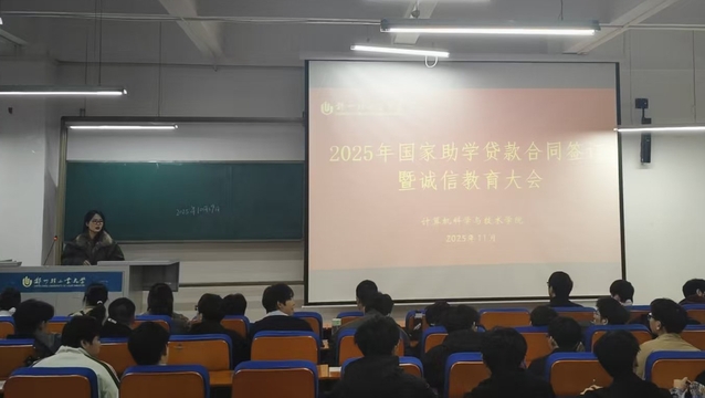 为做好校园地国家助学贷款工作,强化学生诚信意识,近日,计算机科学与技术学院分批次在计算机楼109、118教室组织召开2025年校园地国家助学贷款合同签订会暨诚信教育大会。会议由学院资助工作专职教师潘栎霓主持,资助工作学生助理及全体申请校园地国家助学贷款的学生参加。