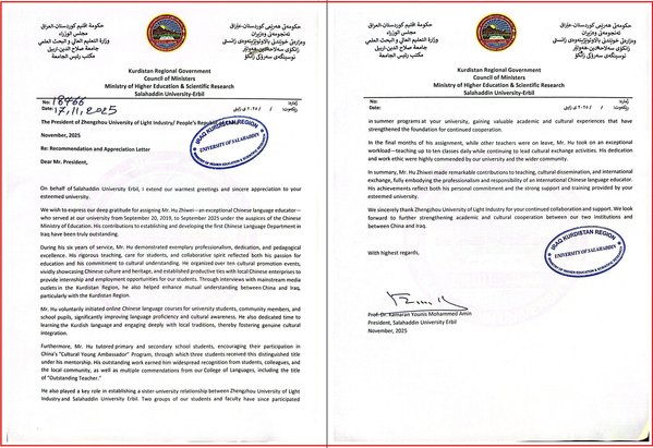 近日,学校收到伊拉克埃尔比勒萨拉赫丁大学致函,高度肯定学校选派赴伊拉克任教的国际中文教师胡志伟六年工作成就,感谢其为中伊文化交流与两校合作做出的突出贡献。