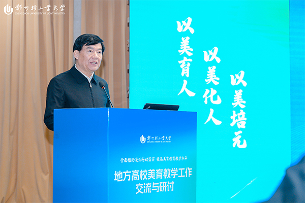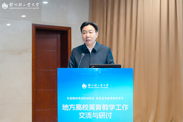 高洪代表全国高校美育教学指导委员会向地方高校美育工作者表示崇高敬意和热烈欢迎,向承办这次交流与研讨活动的郑州轻工业大学表示衷心的感谢。他表示,过去一年,大家弘扬中华美育精神,让美育惠及学生,发挥艺术教育作用。经过共同努力,育人共识深化,课程体系健全,教学模式创新,资源整合加强,校园文化品质提升,区域示范效应初显。美育教指委参与教育部美育政策调研,以教学为重点,推动课程、活动、氛围美育发力,落实保障措施。他提出,此次交流研讨推动构建多元美育学科体系,促进美育与各学科融合让美育成为教育底色,照亮每个课堂与学生心灵。期望参会者传递美育热情与经验,推动美育照亮每一个课堂与大学生心灵,助力高校美育事业蓬勃发展。