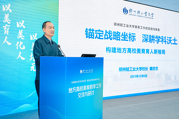 魏世忠作专题汇报。他表示,学校聚焦深入学习贯彻习近平总书记在河南考察时提出“两高四着力”重大要求,立足学校工科特色与中原文化底蕴,构建了“三维坐标”美育发展体系,形成“课程、实践、数智、平台”四位一体格局,他重点分享了学校通过“工科+艺术”优势、非遗进校园、数智化美育资源库建设等创新举措,在提升学生审美创新能力及服务地方经济社会发展方面取得的显著成效,向全国高校展示了美育育人的“郑轻范式”。他指出,学校将继续在各位领导专家的指导下,着力培养既有良好审美观念,具备科技创新能力,又饱含家国情怀的时代新人,为奋力谱写中原大地推进中国式现代化新篇章贡献轻大力量。