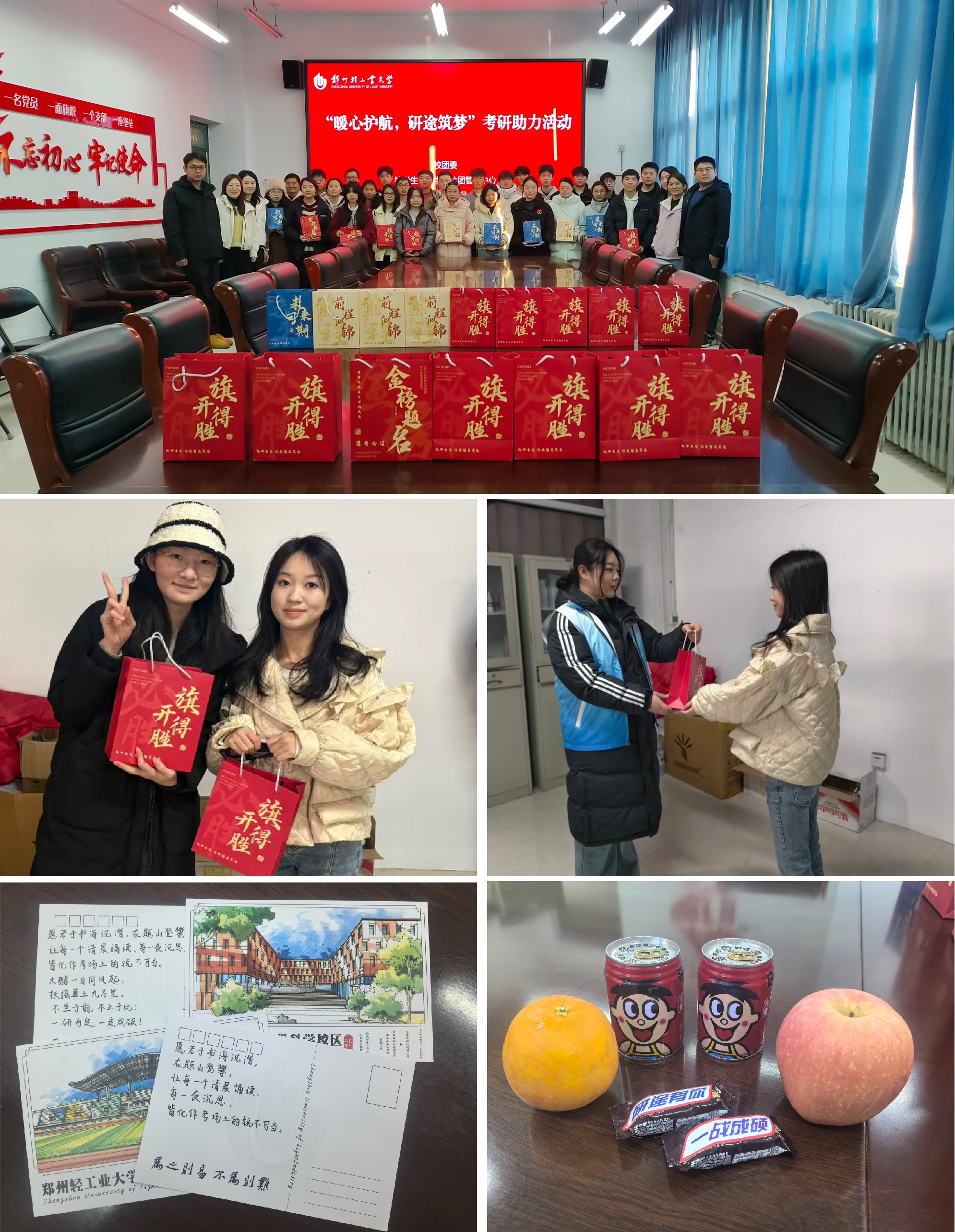 活动现场,校团委老师为考研学生送上特别准备的“暖心加油包”,传递温暖与力量。这份满载心意的加油包,每一件物品都藏着细腻祝福:手写寄语贺卡“卡”满深情,墨香里尽是叮咛与牵挂;旺仔牛奶藏着“牛”气加持,愿学子无畏挑战、锋芒尽显;饱满苹果寄寓“苹”稳上岸,饱满鲜橙寄寓心想事“橙”,盼每一份努力都有回响;暖宝宝持续传递暖意,驱散备考寒冬,温暖研途每一段征途;士力架寓意能量满满,“士”不可挡;专属礼品袋则默默守护,稳稳“袋”着学子奔赴理想彼岸。现场氛围热烈温暖,学子备受鼓舞,纷纷表示通过这次活动感受到学校和老师的关心与鼓舞,一定会带着这份温暖与鼓励,在考研路上奋勇前行。