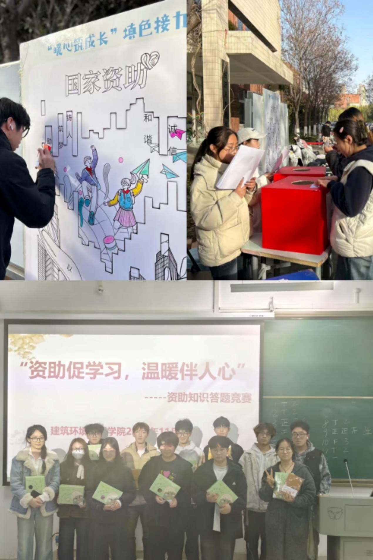 经济与管理学院、建筑环境工程学院等通过开展“资助促学习 温暖伴人心”知识竞赛、“逐光而上,成长有‘思’”系列活动,深化资助育人工作温度,通过三人组队抢答资助政策、趣味竞答、手工实践、团队协作等活动形式,普及国家奖助学金、助学贷款等政策知识,融入感恩教育,引导学生将将所受关怀转化为奋进动力,实现“受助-自助-助人”的良性循环,赋能学生成长成才。
