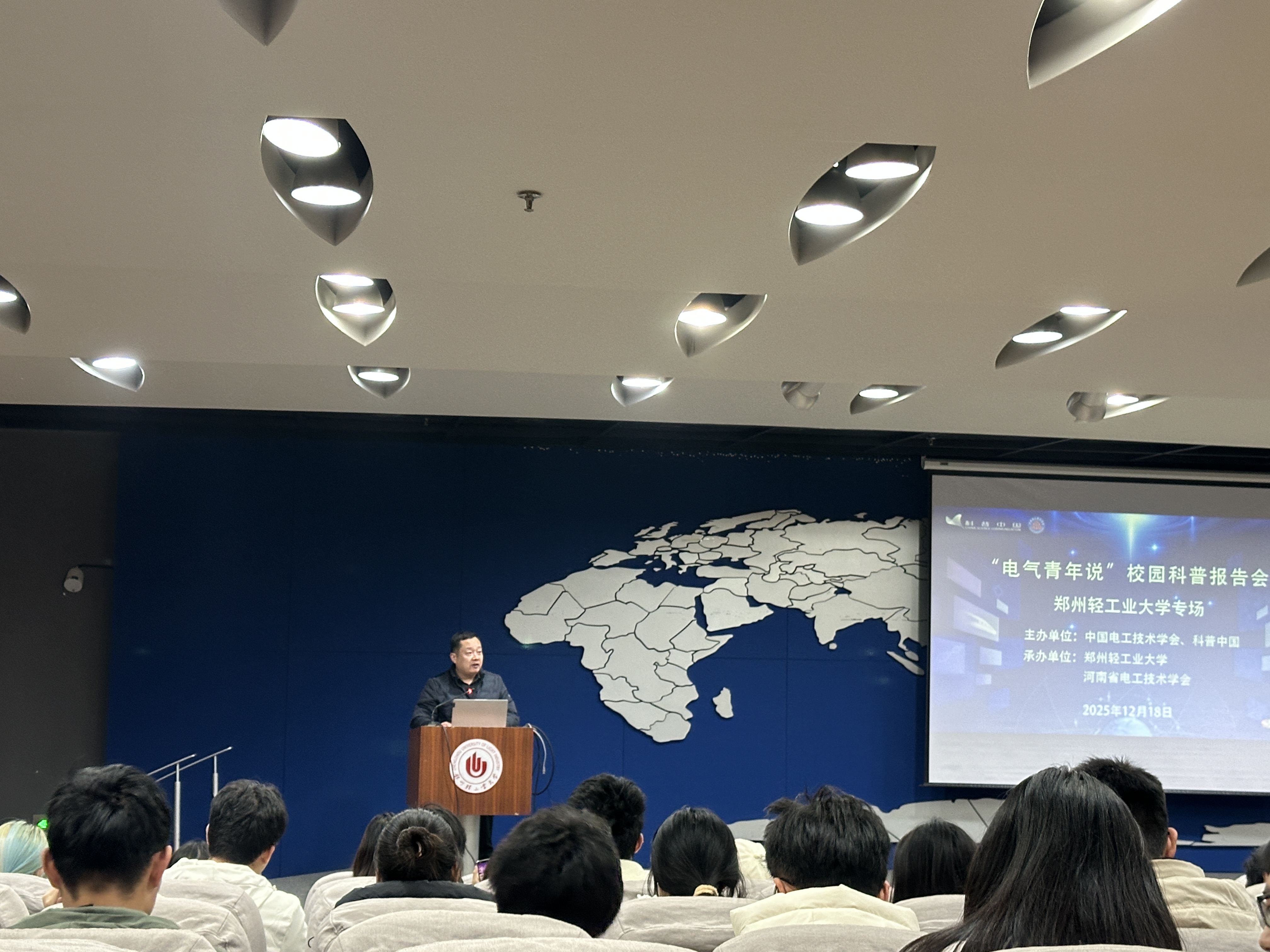 2025年12月18日,由中国电工技术学会与科普中国主办,郑州轻工业大学电气信息工程学院和河南省电工技术学会承办的“电气青年说”校园科普报告会在郑州轻工业大学东风路校区举行。本次活动旨在搭建高校青年学者与学子之间的交流平台,推动电工学科知识的普及与青年科技人才的成长。河南省电工技术学会副秘书长马鑫源、郑州轻工业大学电气信息工程学院党委副书记刘振卫、郑州大学电气与信息工程学院副教授葛国伟、河南科技大学信息工程学院讲师王楠、郑州轻工业大学电气信息工程学院副教授季玉琦、郭磊磊等专家及150余名师生参加会议。郑州轻工业大学电气信息工程学院副教授郭磊磊担任本次活动召集人并主持会议。