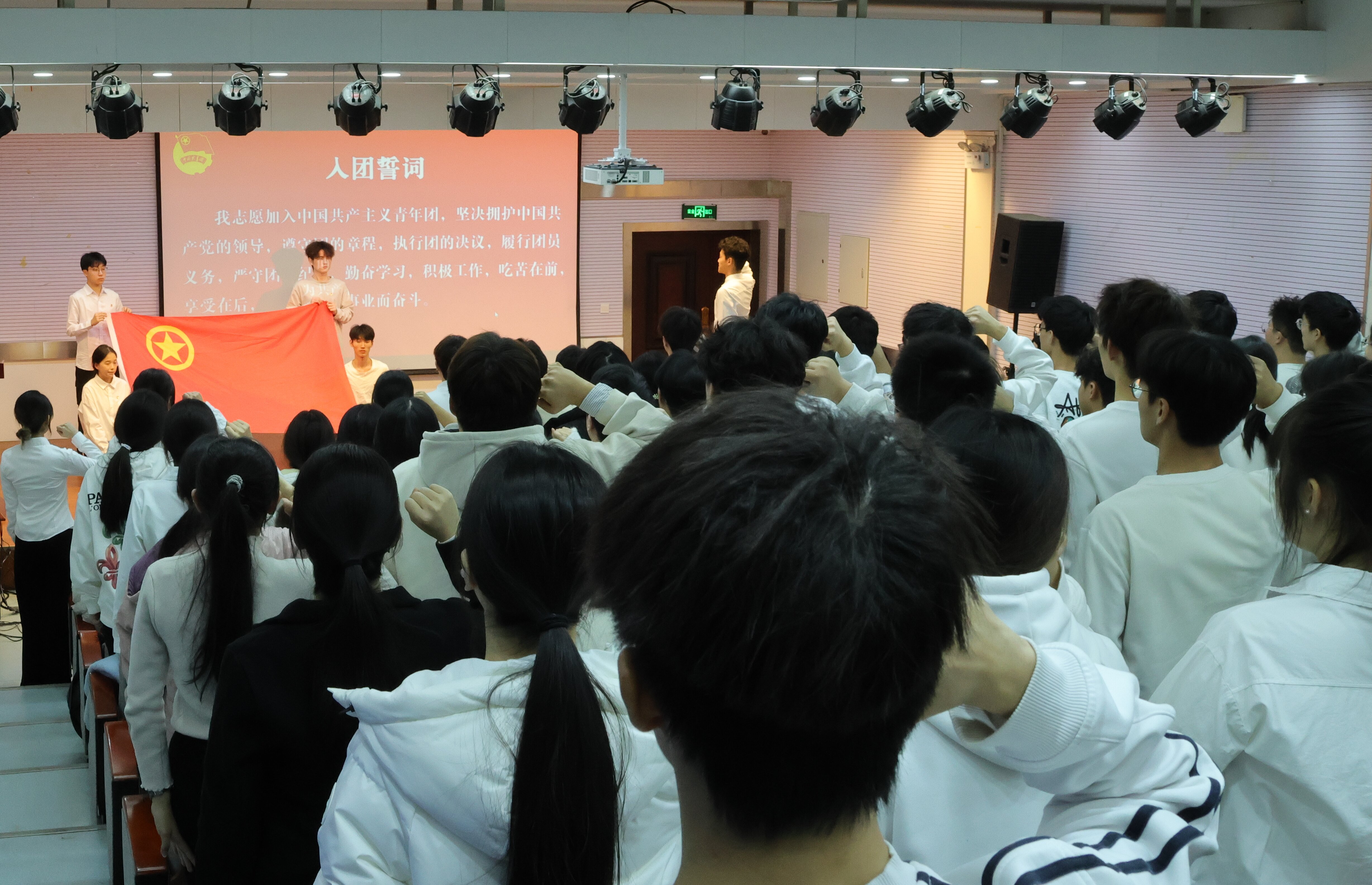 仪式在庄严的国歌声中拉开帷幕。会上,教师代表依次向新发展团员佩戴团徽、颁发团员证,全体新发展团员面向团旗庄严宣誓,在场团干部重温入团誓词,铿锵有力的誓言在会场内回荡,表达了新团员们坚定的理想信念和奋进决心。新发展团员代表和优秀团员代表作发言,新团员代表承诺将以团员标准严格要求自己,不辜负组织的信任和期望。优秀团员代表分享了自身在团组织中的成长经历,勉励新团员们珍惜荣誉,勇于担当。教师代表向新发展团员表示热烈的欢迎和衷心的祝贺,并表示,站在新的起点上,全体新发展团员一是坚定理想信念,做信仰坚定的“追光者”,始终听党话、跟党走;二是厚植家国情怀,做胸怀大局的“奉献者”,用实际行动践行“请党放心,强国有我”的青春誓言;三是练就过硬本领,做实干笃行的“实干家”,练就适应时代发展的过硬本领;四是发扬奋斗精神,做勇毅前行的“开拓者”,展现新时代青年的昂扬风貌。