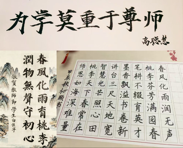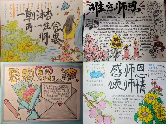 自教师节主题活动启动以来,学院面向全体学生发起“笔墨绘师恩”书法、绘画、手抄报作品征集活动,得到了各年级学生的积极响应。同学们以笔为媒、以画为语,将对老师的敬爱与感谢融入每一幅作品之中。书法作品里,诗句苍劲有力,笔墨饱含敬意,笔走龙蛇、气韵生动,凝聚着对师德的崇高礼赞;绘画作品中,有老师在讲台上传道授业的专注身影,有课后与学生交流答疑的温暖场景,生动还原了日常教学中的动人瞬间;手抄报则图文并茂地记录了师生相处的点滴细节,字里行间满是真诚与感动。除作品征集活动之外,节日当天,学院各班级学生还自发开展了形式多样的感恩行动,让温馨与感动充满校园的每一个角落。在教学楼里,不少班级的学生提前来到上课教室,为老师递上一杯热水或是送上一束鲜花,全班同学齐声喊出的“教师节快乐”,更是给老师带来满满的幸福。也有学生主动走到办公室,为老师送上献花、贺卡或者自己手工制作的小礼物,与老师亲切交流学习心得与生活趣事。这些自发的小举动,充满了真挚的情感,不仅拉近了师生的距离,更让尊师重教的种子在学生心中生根发芽。