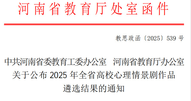 近日,中共河南省委教育工委办公室、河南省教育厅办公室发布《关于公布全省高校心理情景剧遴选结果的通知》(教办思政〔2025〕539号),我校心理健康教育中心指导、电子信息学院师生团队参演的心理情景剧《逐光》被评为河南省高校心理情景剧优秀作品。