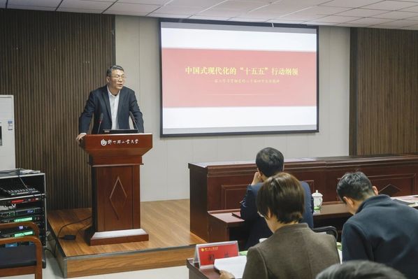 马寒以《中国式现代化的“十五五”行动纲领》为题,对党的二十届四中全会精神进行解读辅导。实践证明,用五年规划引领经济社会发展,是符合中国国情、彰显制度优势的体制安排,五年规划取得的成功只有在中国共产党坚强有力领导下才能实现。他表示,郑州轻工业大学马克思主义学院作为河南省高校示范性马克思主义学院,应在学习贯彻全会精神上站位更高、理解更深、行动更实,不断推进新时代思政课和马克思主义学院高质量发展。